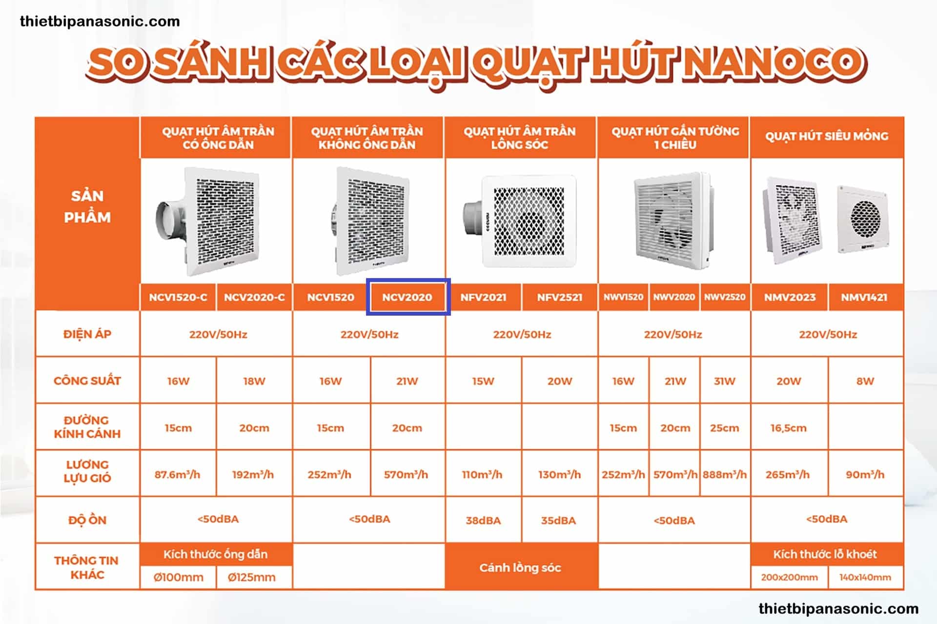 So sánh Quạt hút NCV2020 với các loại quạt hút Nanoco khác