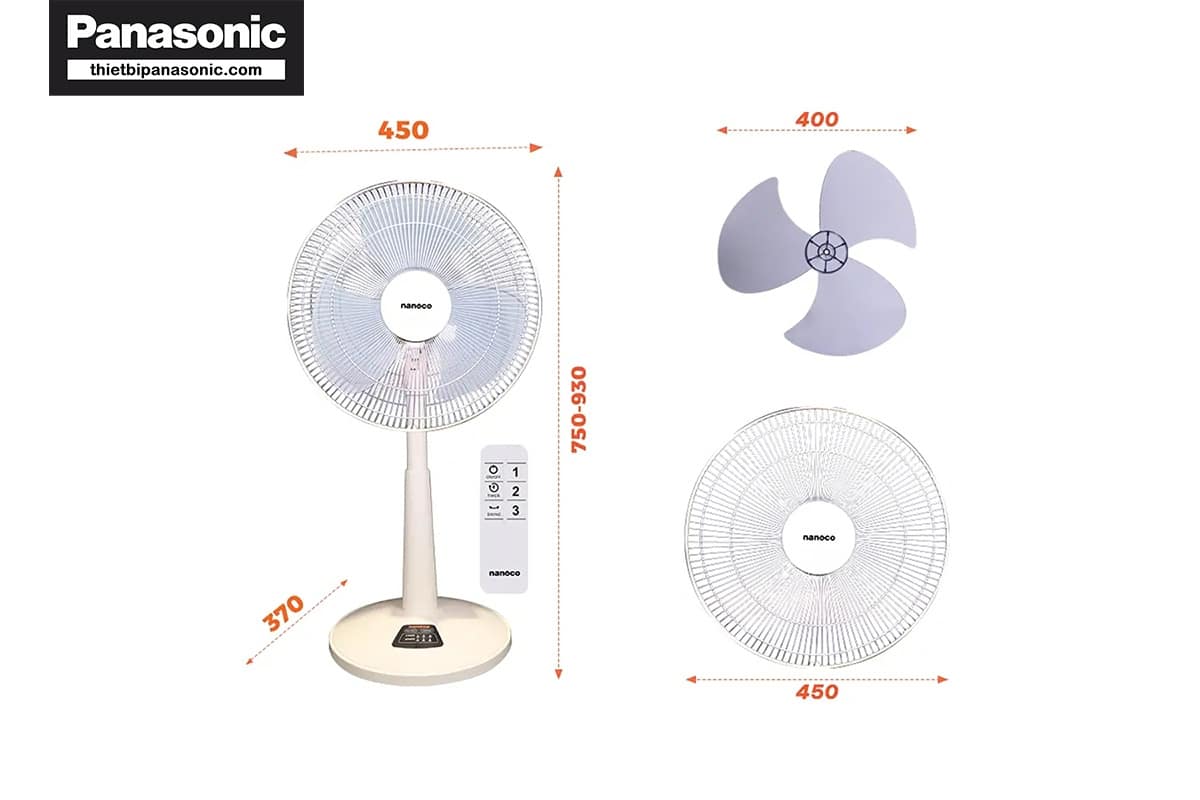 Kích thước của các thành phần quan trọng trên Quạt lửng Nanoco NLF1624RC-BE Có Remote