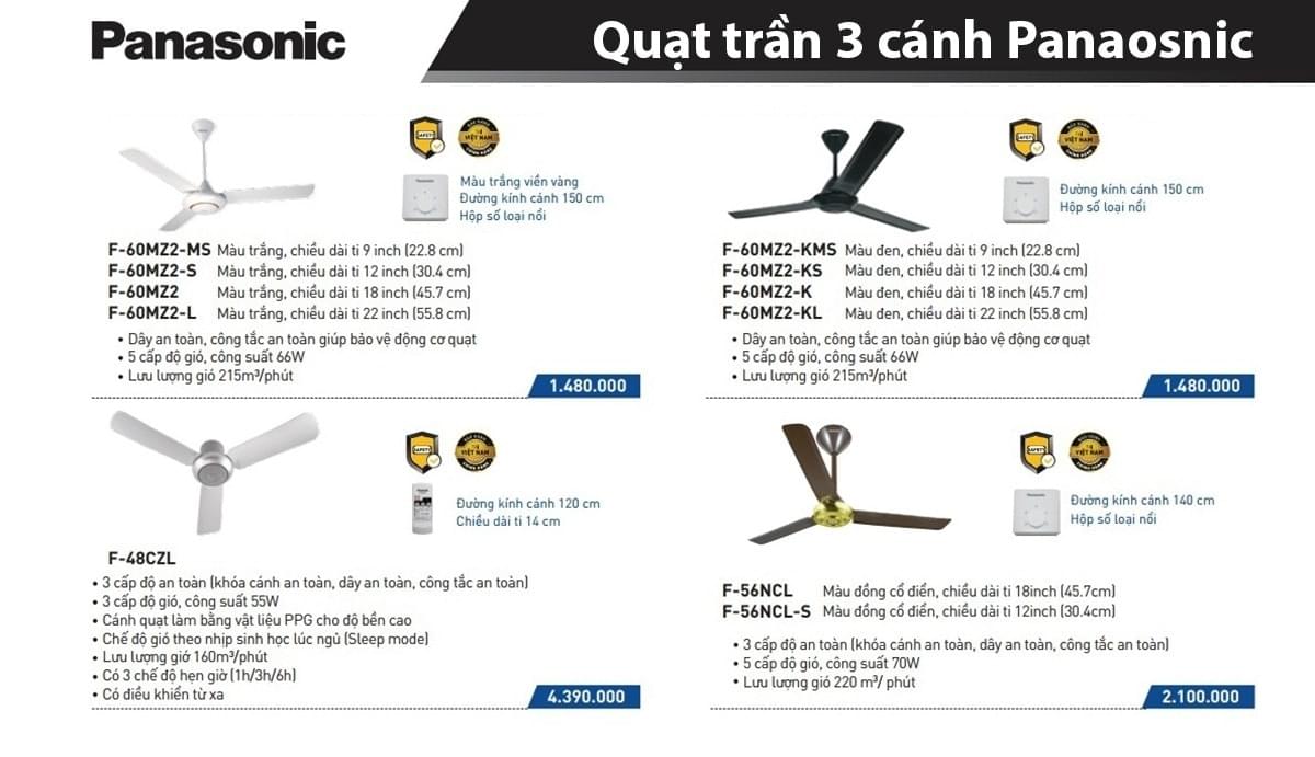 - Ngoài ra, giá quạt trần Panasonic 3 cánh cũng rất phải chăng, phù hợp với khả năng tài chính của hầu hết các gia đình