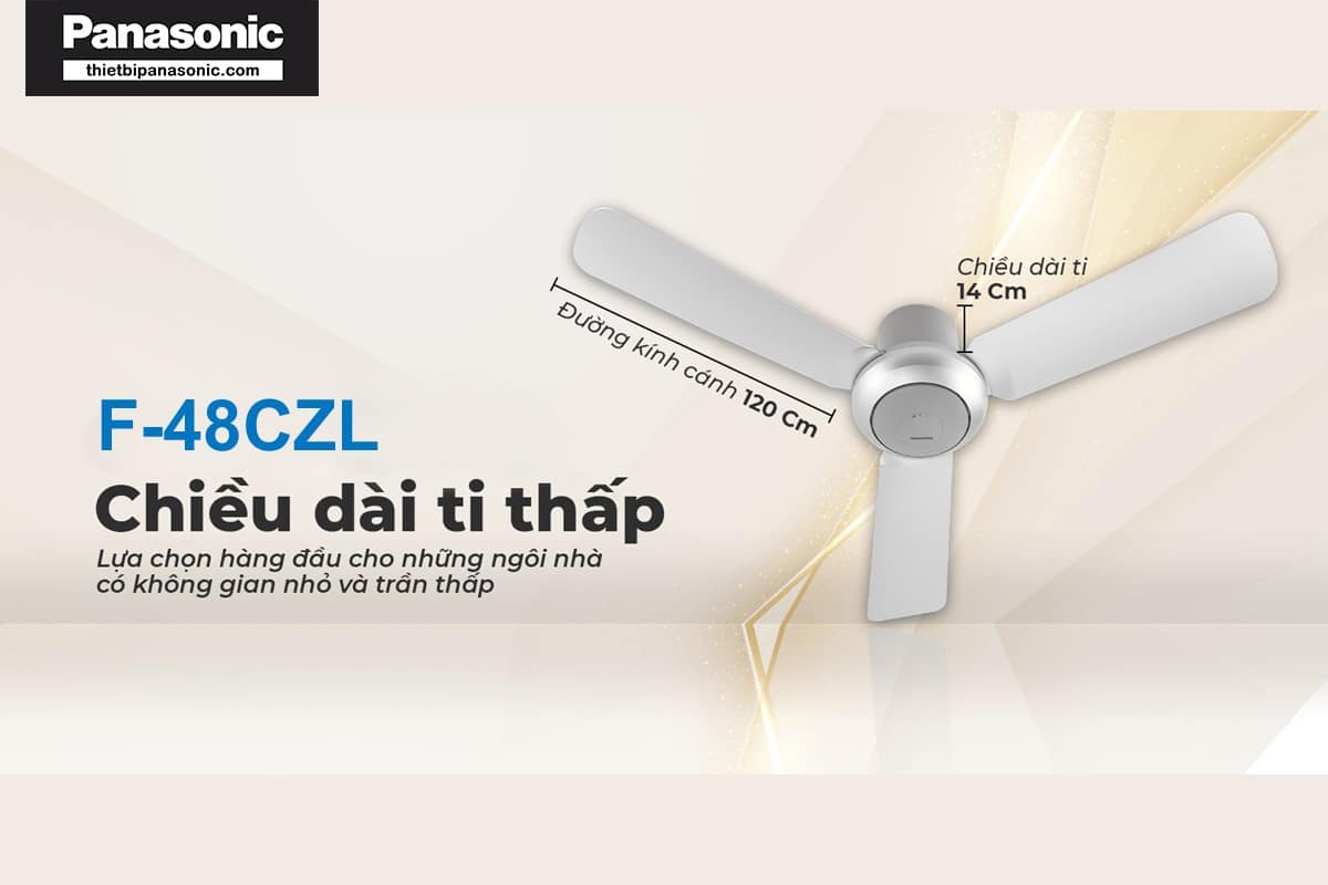 Quạt trần Panasonic 3 cánh F-48CZL với thiết kế đơn giản, cùng tông màu bạc sang trọng, với chiều dài ti quạt 14cm, thích hợp sử dụng cho các trần nhà thấp.