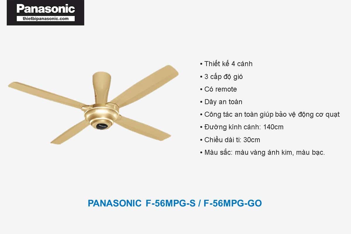 Riêng Mẫu quạt trần Panasonic 4 cánh F-56MPG-GO được thiết kế rất đẹp, màu vàng giả kim loại tạo nên sự sang trọng cho toàn bộ gian phòng. Rất phù hợp khi lắp trong các khách sạn, resort hay homestay cao cấp.