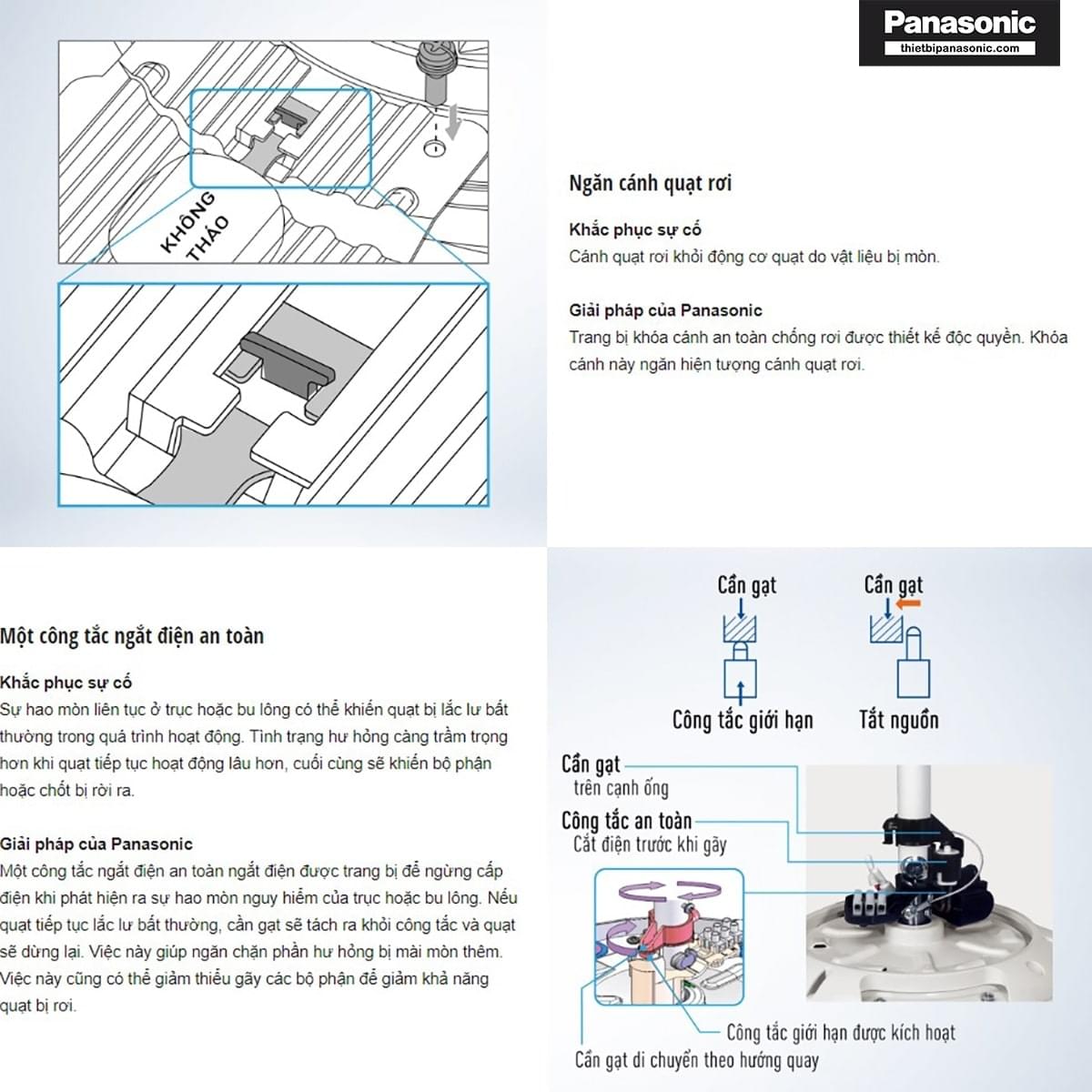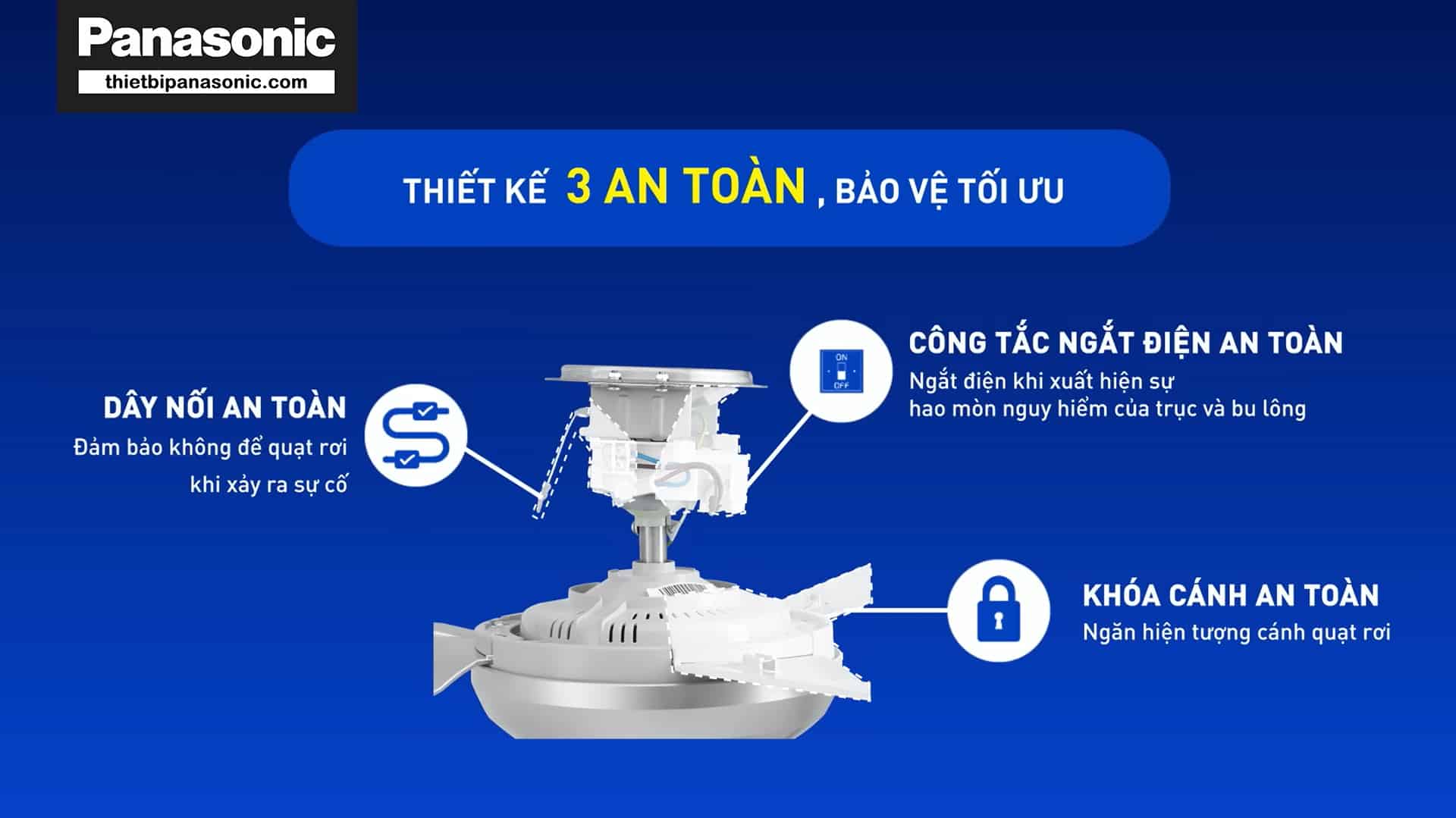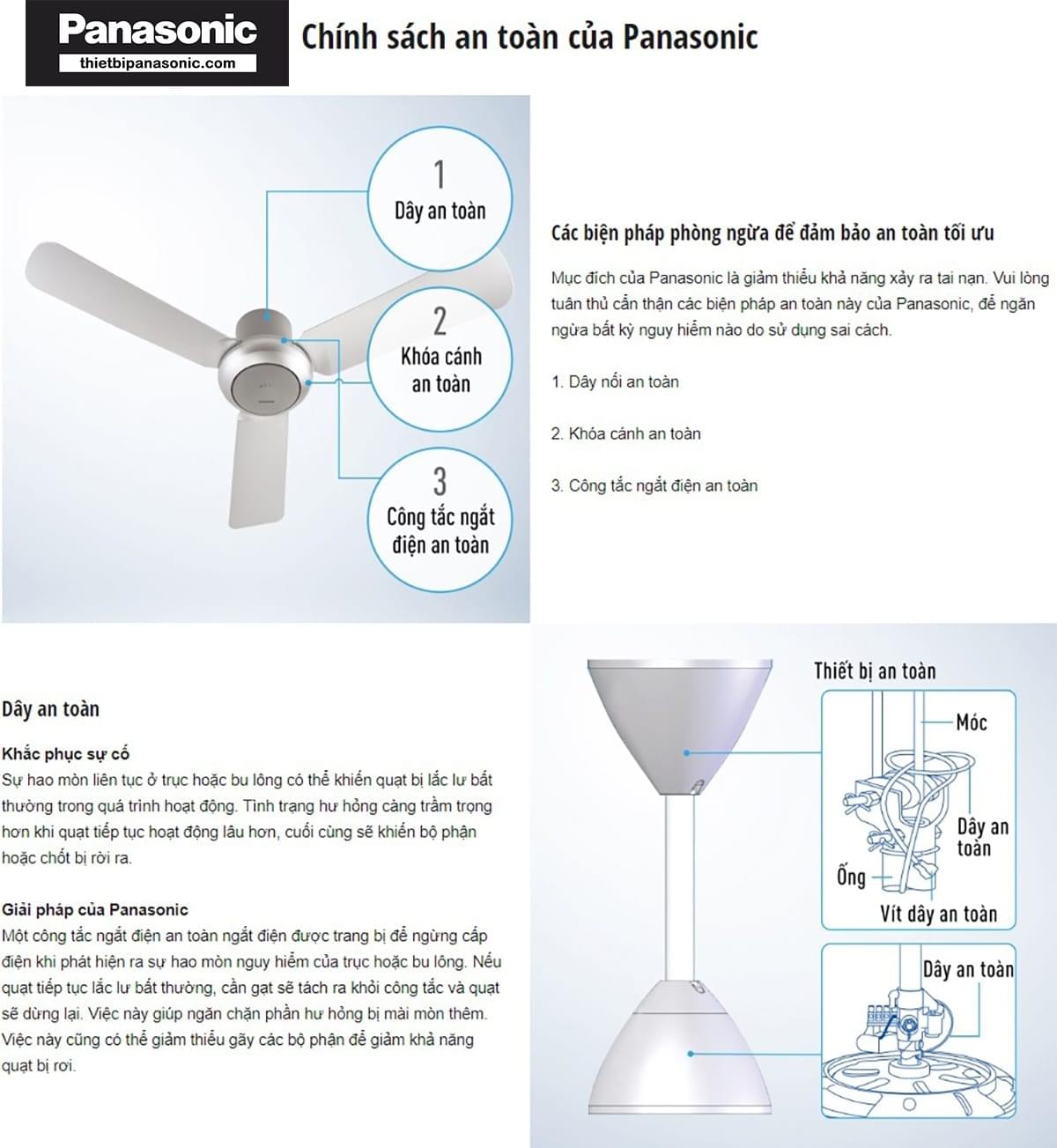 - Quạt trần Panasonic F-48CZL được tích hợp 3 chế độ an toàn bao gồm: chốt an toàn, khóa cánh an toàn và công tắc an toàn. Với các chế độ này, quạt hạn chế những phát sinh có thể xảy ra trong quá trình vận hành, bảo vệ tốt nhất cho người dùng trong quá trình sử dụng.