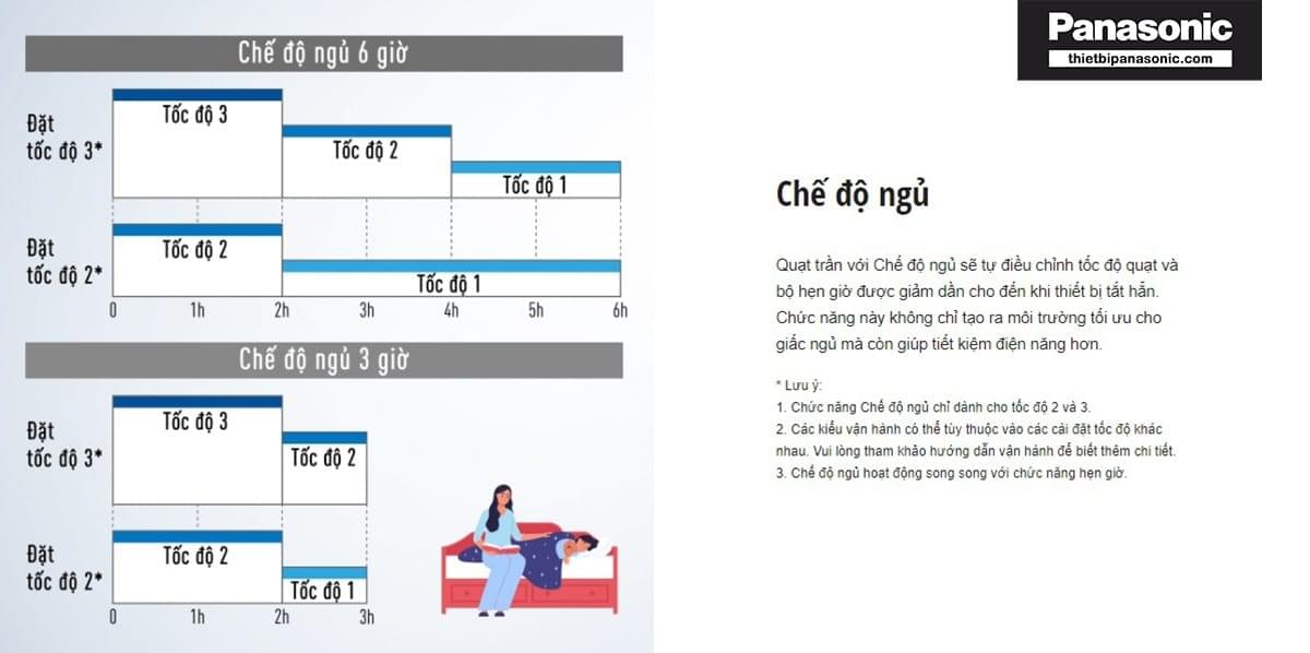 - Quạt trần Panasonic 3 cánh có điều khiển F-48CZL còn được trang bị chế độ ngủ (Sleep mode). Khi kích hoạt chế độ này, tốc độ quay của quạt sẽ giảm dần theo thời gian đã hẹn. Nhờ vậy, gia đình bạn sẽ có những giấc ngủ trọn vẹn, sức khỏe đảm bảo và tiết kiệm chi phí điện năng hàng tháng đấy!