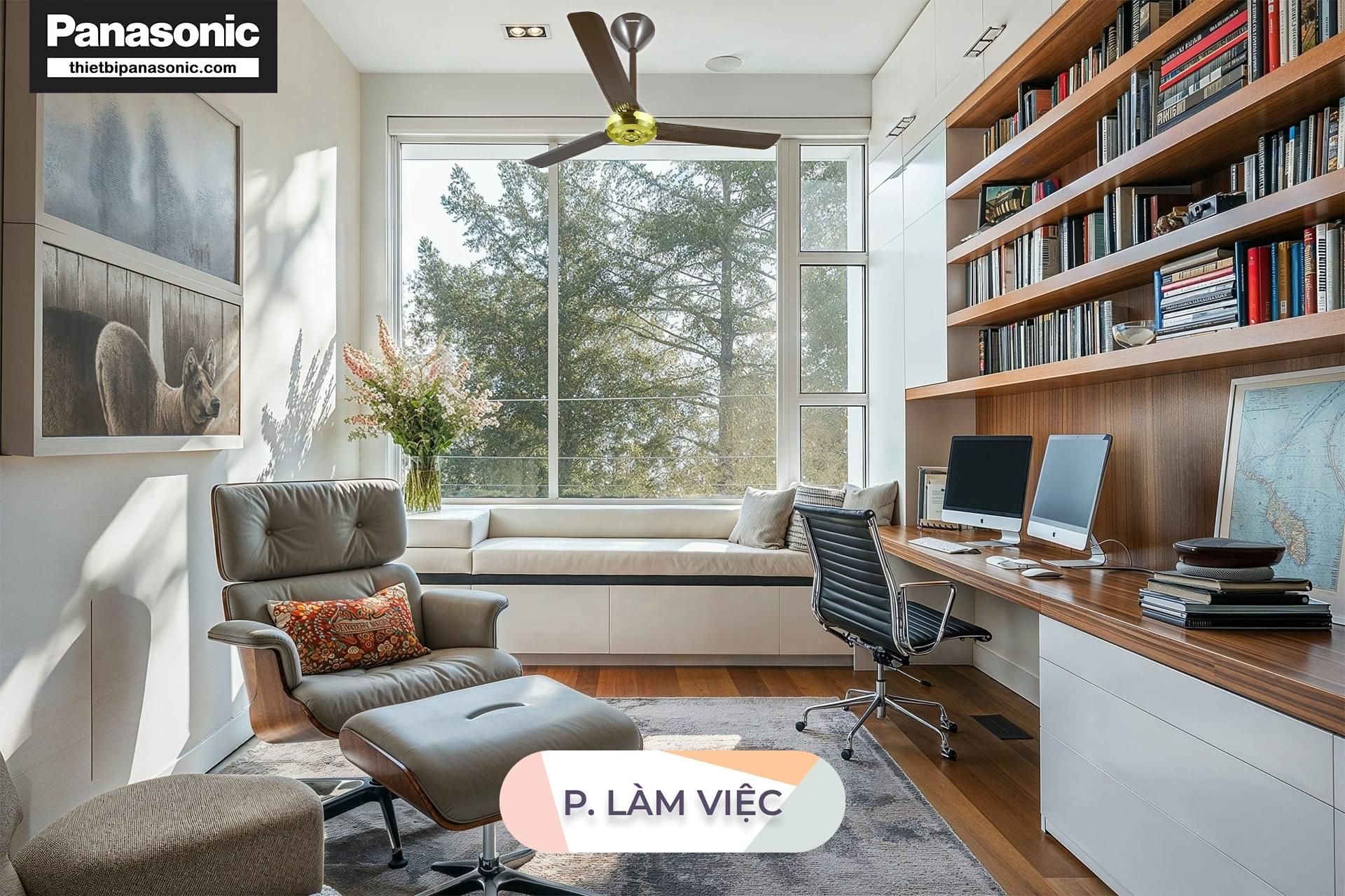Quạt trần Panasonic 3 cánh F-56NCL ti dài được lắp đặt trong không gian của phòng làm việc