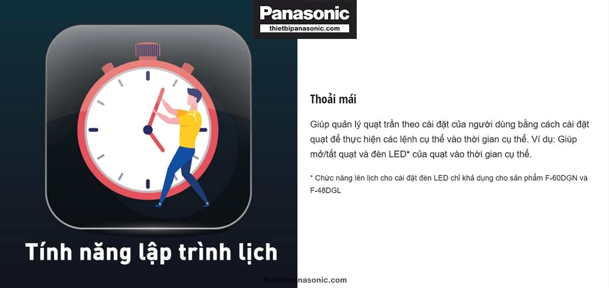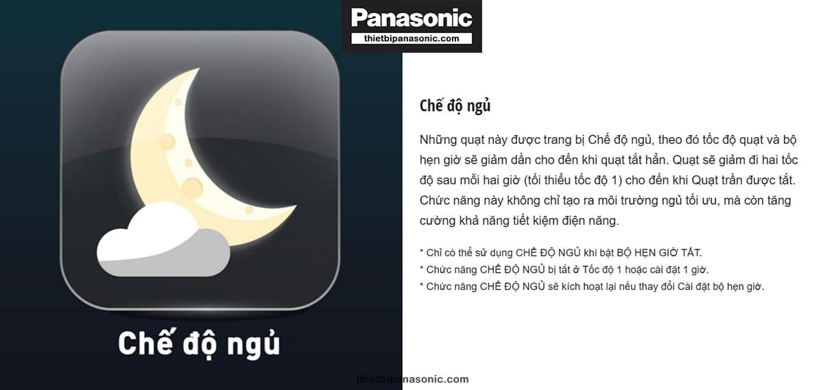 Bên cạnh đó, Panasonic trang bị cho quạt trần Panasonic F-60DGN chế độ gió theo nhịp sinh học lúc ngủ (sleeping mode) có thể điều chỉnh linh hoạt và chế độ hẹn giờ tắt/mở trong vòng 24 tiếng. Những tính năng này giúp bạn hẹn giờ tắt quạt theo nhu cầu sử dụng, không chỉ giúp gia đình bạn có những giấc ngủ trọn vẹn mà còn tiết kiệm được một lượng lớn điện năng mỗi tháng.