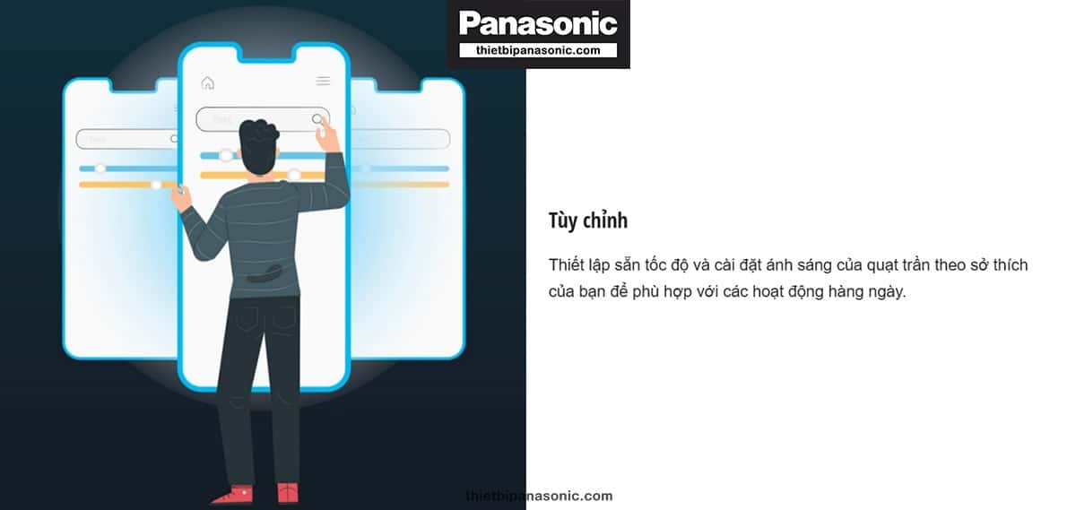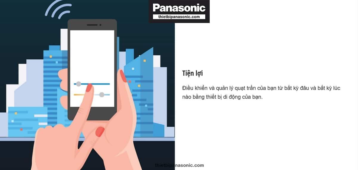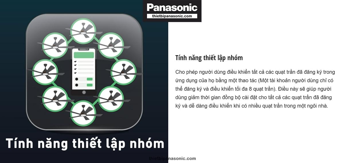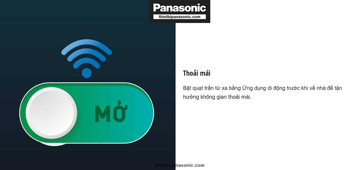 Nếu bạn đã chán với việc điều khiển bằng Remote thông thường, sản phẩm Quạt trần Panasonic 5 cánh có đèn cho phép bạn điều khiển bằng ứng dụng trên điện thoại di động. Để điều khiển quạt trần bằng điện thoại, người dùng cần kết nối ứng dụng với bộ định tuyến phát Wifi (thiết bị di động cần có iOS 12 và Android 6.0 trở lên). Một tài khoản có thể kết nối tối đa tới 8 quạt trần Panasonic và mỗi quạt trần kết nối được với 4 tài khoản khác nhau.