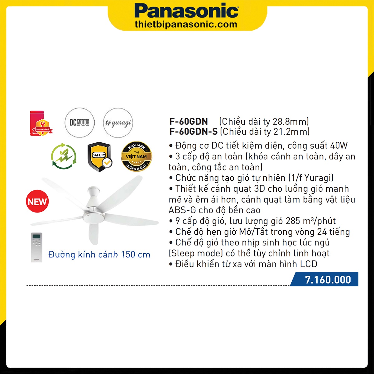 Tại Thiết Bị Điện Panasonic, chúng tôi tự hào là địa chỉ phân phối chính hãng các dòng sản phẩm quạt trần Panasonic, cam kết hoàn tiền 200% nếu phát hiện hàng giả. Hãy liên hệ ngay với chúng tôi để được tư vấn và tận hưởng nhiều ưu đãi hấp dẫn, cùng dịch vụ hỗ trợ lắp đặt tận nơi. Nhanh tay sở hữu chiếc quạt trần Panasonic có điều khiển F-60GDN-S để không gian sống của bạn luôn mát mẻ và phong cách!