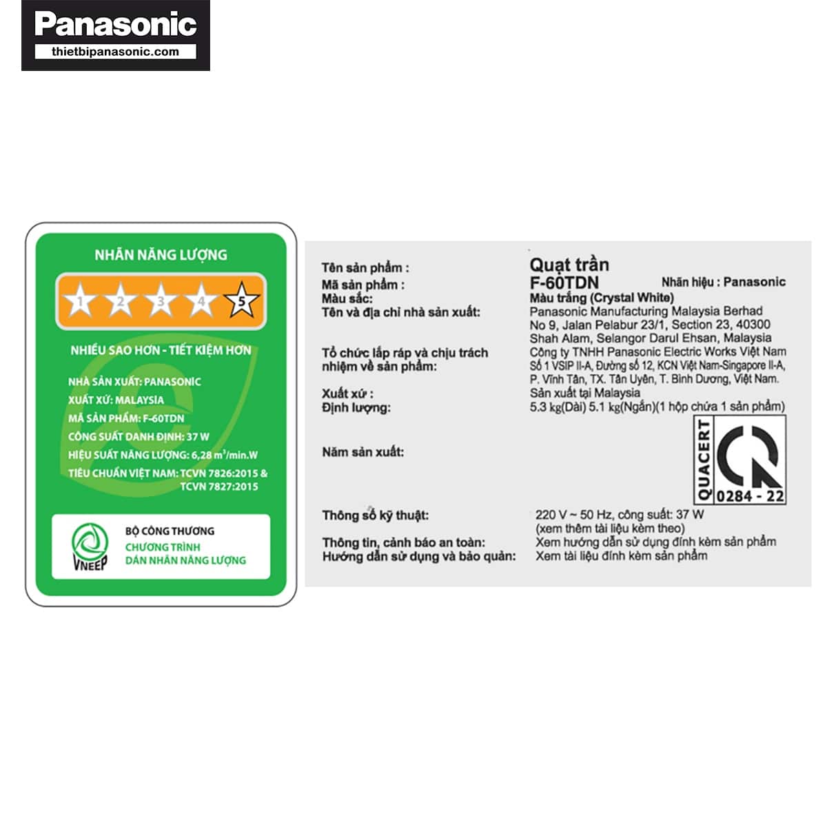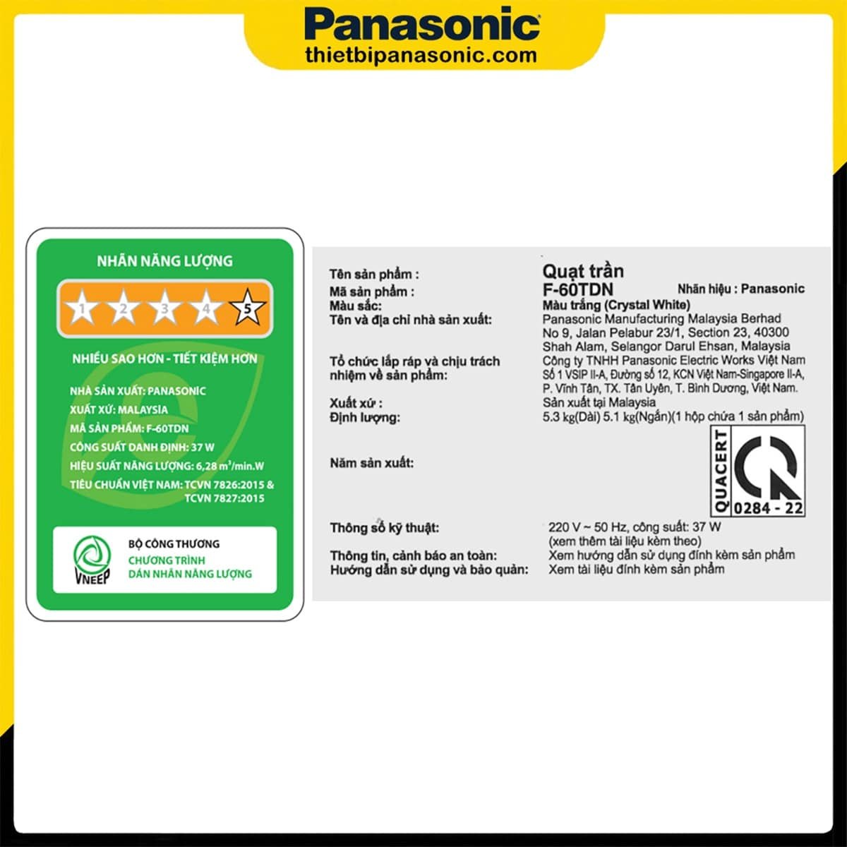 Quạt trần Panasonic 5 cánh F-60TDN-S đến từ thương hiệu nổi tiếng hàng đầu trong lĩnh vực điện tử gia dụng, đa dạng chủng loại và mẫu mã trong thiết kế, màu sắc phong phú. Chắc chắn, khi nhắc đến thương hiệu quạt trần Panasonic, người tiêu dùng sẽ an tâm về chất lượng, giá cả và dịch vụ hậu cần.